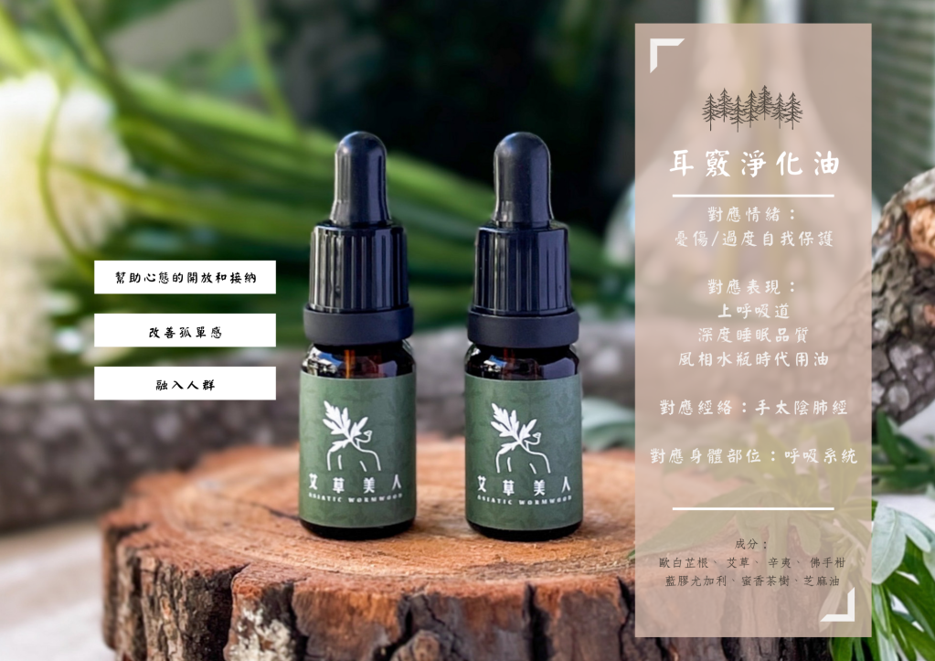 耳竅淨化油以芝麻油為基底,內含歐白芷根、艾草、辛夷、尤加利等中西方精油,可以直接塗抹在耳朵周圍,幫助耳竅、鼻腔的暢通,適合容易鼻塞、濕耳屎、眼壓腦壓高的族群,同時對上呼吸道有強化免疫的作用。
