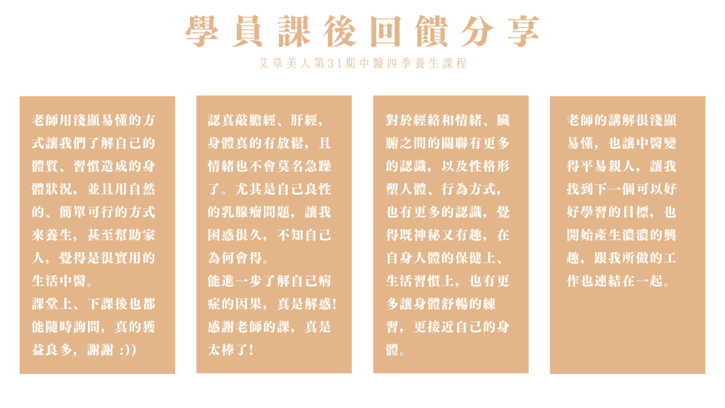 課程中也會分享快速判斷個人先天體質的技巧。從了解個人體質入手,將所學知識與日常生活緊密結合,輕鬆找到最適合的養生保健方法,並清楚知道需要預防的疾病風險,即早預防,照顧自己和家人的健康!